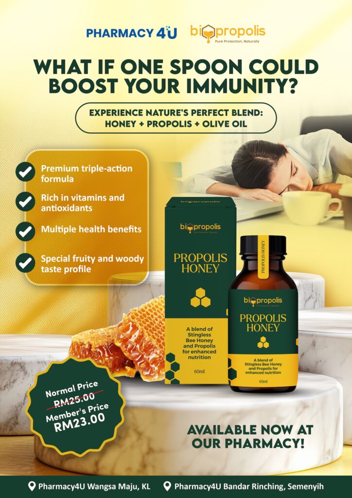 Di Pharmacy4U, kami membawakan Propolis Honey berkualiti tinggi yang dirumus khas untuk menyokong imuniti, melegakan sakit tekak, dan mengekalkan kesihatan harian seisi keluarga.